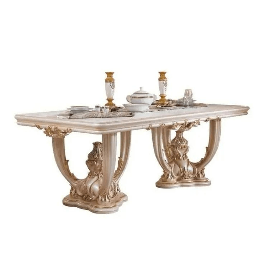 Indulge in the opulence of the Rococo era with this exquisite dining table. Inspired by the grandeur of 18th-century European design, this table features a meticulously crafted marble top and ornate wood carvings finished in elegant cream and gold tones. The Rococo design is characterized by its elaborate detailing and graceful curves, making this table a true statement piece. The combination of marble and wood ensures durability and timeless style. Elevate your dining experience with this superior product from Daabadi Furniture supplier, where quality meets artistry.