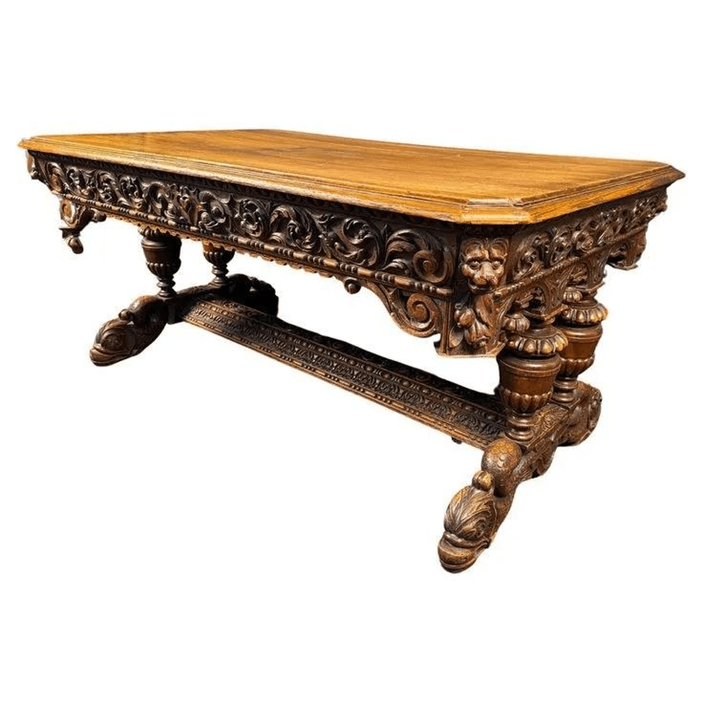 The Renaissance Style Wood Dining Table embodies the opulence of the Renaissance era, featuring a richly carved wooden frame and a durable tabletop. Inspired by the grand dining halls of the Italian Renaissance, this table is meticulously crafted from high-quality wood, showcasing detailed carvings and a warm brown finish. Perfect for creating a sophisticated dining atmosphere, this table is both a functional piece of furniture and a work of art. With Daabadi Furniture supplier, you are assured of superior quality and timeless design. Its robust construction ensures longevity, making it a valuable addition to your home.
